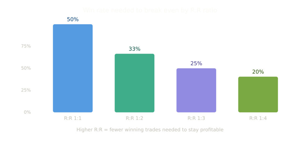 Most experienced traders target a minimum of 1:2, and many prefer 1:3 or higher. A strong R:R ratio means your strategy can still be profitable even when you lose more often than you win.