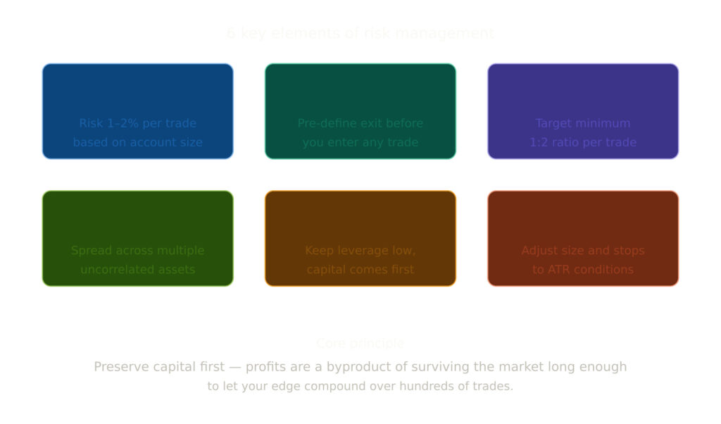 Risk management in trading is a structured system of rules and tools designed to protect your capital from severe, account-damaging losses. It tells you how much to risk on each trade, where to exit when you’re wrong, and how to stay in the game long enough to let your edge play out.