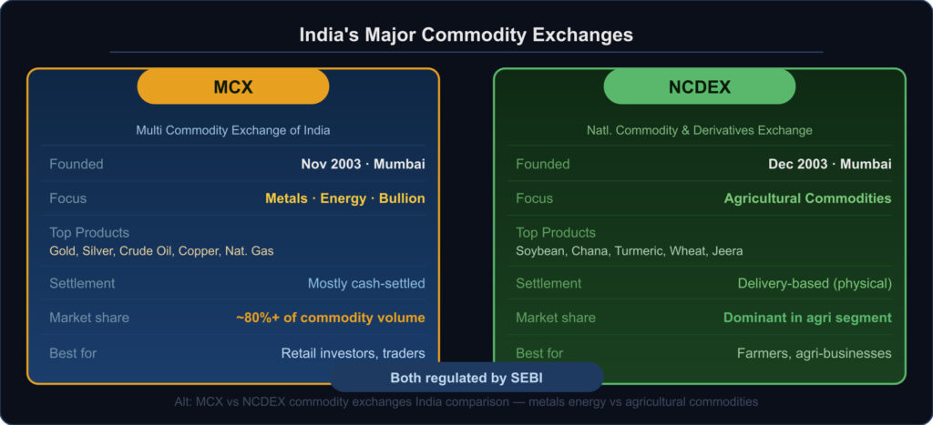 In India, commodity trading is conducted on regulated exchanges like MCX and NCDEX, both supervised by the Securities and Exchange Board of India (SEBI). Most retail traders participate through futures and options contracts rather than buying physical goods.