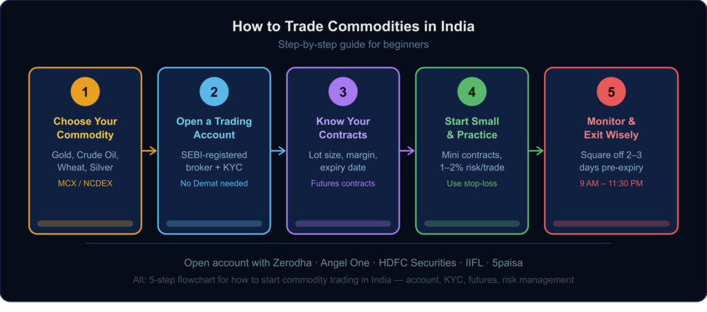 Alt: “Step-by-step flowchart showing how to start commodity trading in India with MCX broker account” | Caption: “Starting commodity trading in India is straightforward once you know the five essential steps.”