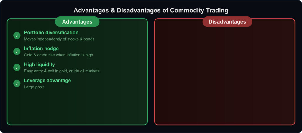 - Investment and Speculation: Traders profit by forecasting price movements. When managed with discipline, commodity trading can generate returns independent of the stock market — making it a valuable diversification tool.